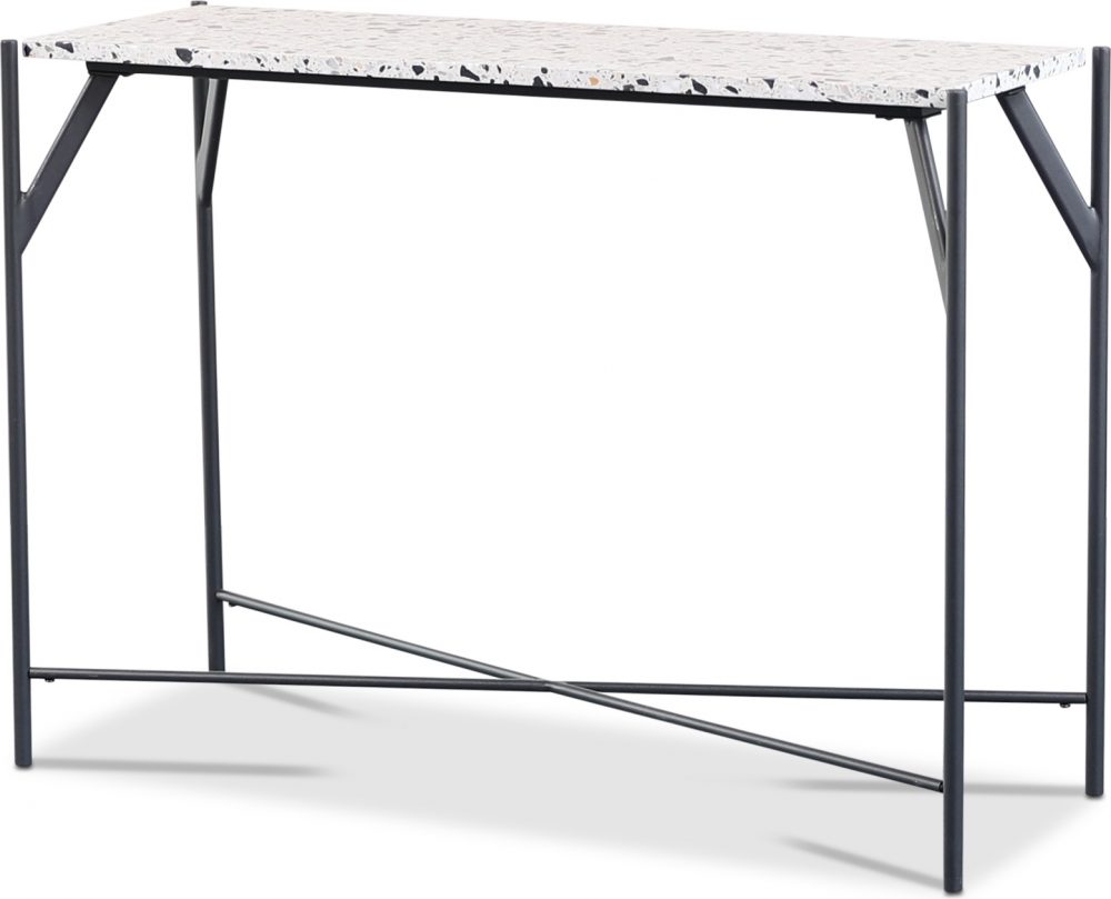 Terrazzo konsolbord med en cosmos terrazzo stenskiva (Ljus botten med svarta, bruna och grå stenar i) och AIR svart metallunderrede.