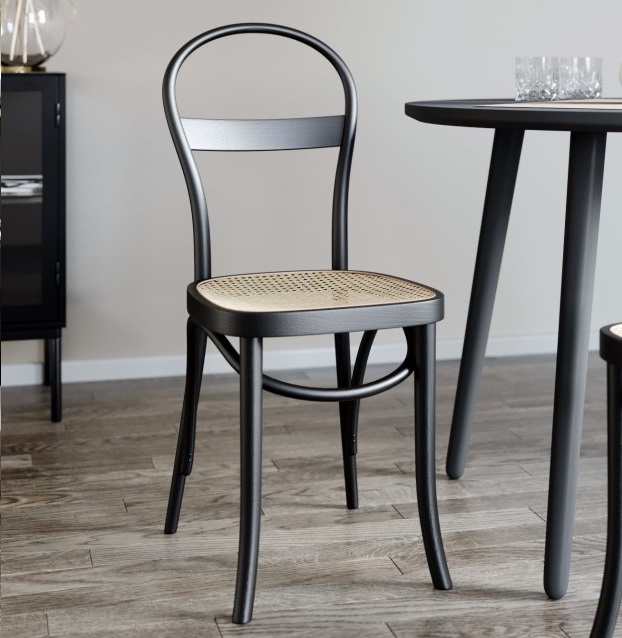 Fårö matgrupp från Skånska Möbelhuset, klassiskt matbord 140x90 cm med vitt underrede och en toppskiva i oljad ekfanèr. Det ingår 4 stycken matchande Danderyd No.16 matstolar i svartlackat trä med rotting sits.