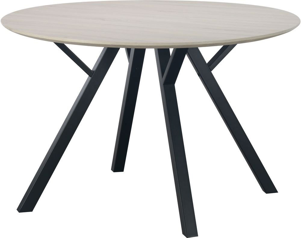 Matgrupp från Skånska Möbelhuset, Smokey matbord 120 cm i diameter med mdf-toppskiva med ljus betsad ekfoliering. Medföljer 4 st matchande Carisma sammetstolar i blå sammet med svarta ben.