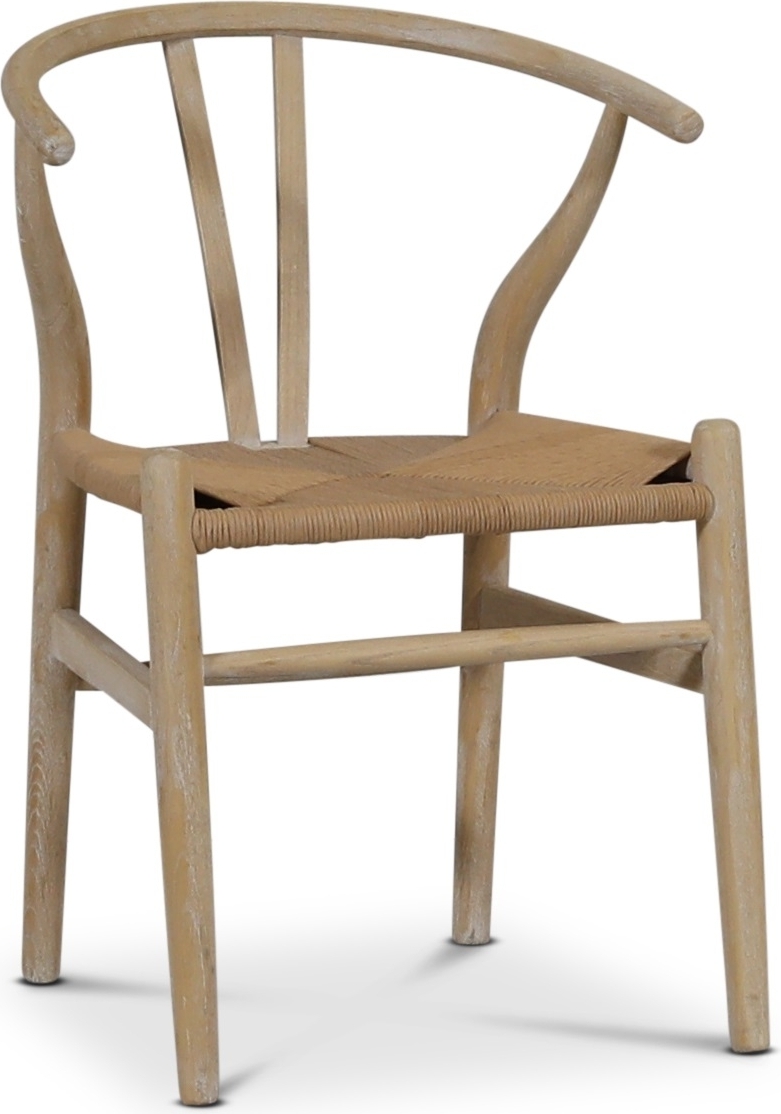 Klassiska matstolar i karm-modell med stomme i whitewash-behandlat almträ och flätad repsits av papperssnöre. Levereras monterad.